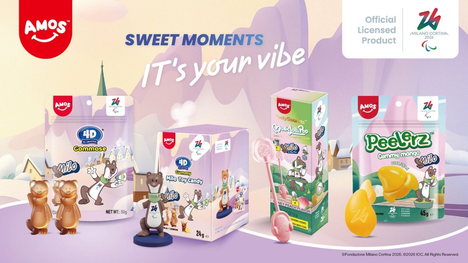 Die Milano Cortina 2026 lizenzierte Süßigkeitenkollektion, die von Amos Sweets unter Lizenz des Internationalen Olympischen Komitees entwickelt wurde, wurde veröffentlicht, um Fans und Süßigkeitenliebhabern verspielte und innovative Leckereien zu bieten. Die speziell für diesen Anlass entworfene Kollektion bietet witzige Designs, einzigartige Texturen und interaktive Erlebnisse, die die Olympischen Winterspiele mit einem Hauch von Süße feiern.